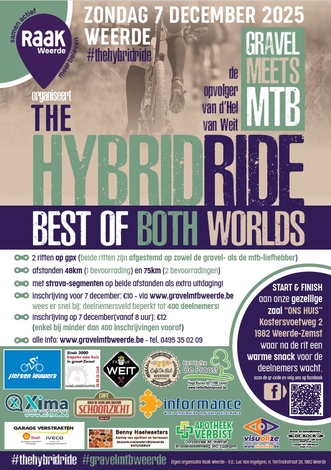 De hybride veldtourtocht zal zowel sectoren voor gravel als mountainbike hoogtepunten tot jullie brengen via een beperkt toegelaten deelnemersveld voor de eerste 400 ingeschrevenen. Start en aankomst vindt plaats op zondag 7 december 2025 aan onze eigen zaal “Ons Huis Weerde” in de Kostersvoetweg 2 te Weerde-Zemst.